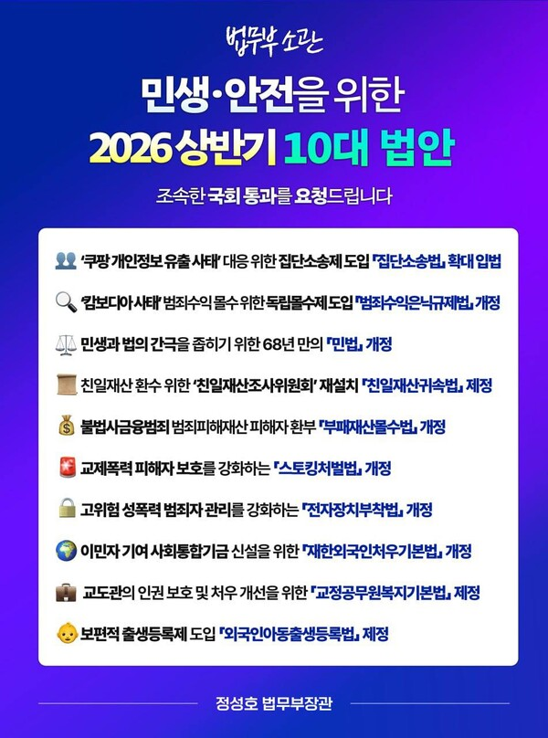 정성호 법무, 민주당 추미애·한병도 예방…'민생 10대 법안' 입법 추진 - 10번째 미등록아동출생등록 2026-01-26 조회 680 관련링크 https://www.chosun.com/national/court_law/2026/01/22/ZT7Q47Q3YZB4JIGNE… 본문 법무부가 올해 상반기에 ‘민생‧안전 10대 법안’을 선정해 집중적인 입법을 추진할 계획이라고 22일 밝혔다. 이전글은희곤 목사, “평화와 인권의 가교를 잇다” 문화체육관광부장관 표창 수상 다음글2026. 미등록희망포럼 첫 실무자 모임 목록